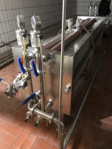 – Kieselgur-Rahmenfilter, mit 29 KG-Rahmen in VA, außenliegenden Steigleitungen, Schauglasarmaturen mit Druckmanometer, mit KG-Austragwanne mit Schnecke in VA, mit KG-Dosiergerät